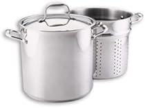 Our pasta set includes a 12-quart covered stockpot and a 12-quart pasta insert. The advantages of cooking with this insert are many. The insert fits into the pot and the pasta cooks within the insert. When the pasta is cooked simply lift the insert above the pan to drain. Because the pasta is lifted rather than poured draining is a gentle process ideal for delicate filled pasta such as ravioli. As the water drains back into the cooking pot there is no worry of water backing up into your sink if your colander drains too slowly. And if you decide you need to cook a second batch of pasta the water can be brought back to a boil quickly. Not just for pasta the insert may be used for blanching vegetables boiling corn or making stocks and the stockpot alone will hold a party size batch of chowder.